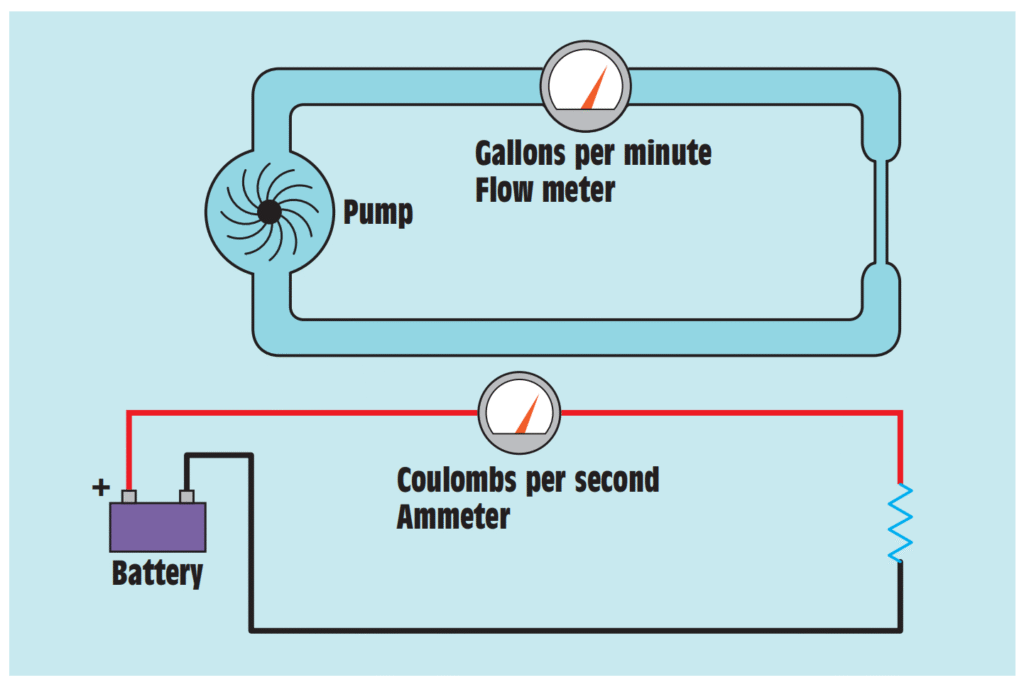 The ampere (A) is equal to 1 coulomb per second. Notice that the definition of an ampere involves a quantity measurement, the coulomb, and a time measurement, the second. One ampere of current flows through a wire when 1 coulomb flows past a point in one second. The ampere is a measurement of the amount of electricity that is flowing through a circuit. In a water system, it would be comparable to gallons per minute or gallons per second. The letter I, which stands for intensity of current, and the letter A, which stands for ampere, are both used to represent current flow in algebraic formulas. This text uses the letter I in formulas to represent current.