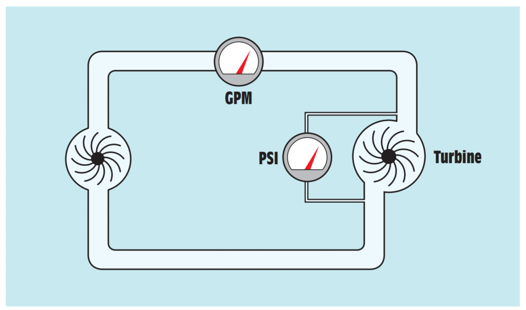 To understand watts, return to the example of the water system. Assume that a water pump has a pressure of 120 pounds per square inch (PSI) and causes a flow rate of 1 gallon per second. Now assume that this water is used to drive a turbine, as shown below. The turning force or torque developed by the turbine is proportional to the amount of water flow and the pressure forcing it against the turbine blades. If the pressure is increased and the flow rate remains constant, the water will strike the turbine blades with greater force and the torque will increase. If the pressure remains constant and a greater volume of water is permitted to flow, the turbine blades will be struck by more pounds of water in the same amount of time and torque will again increase. As you can see, the torque developed by the turbine is proportional to both the pressure and the flow rate of the water.